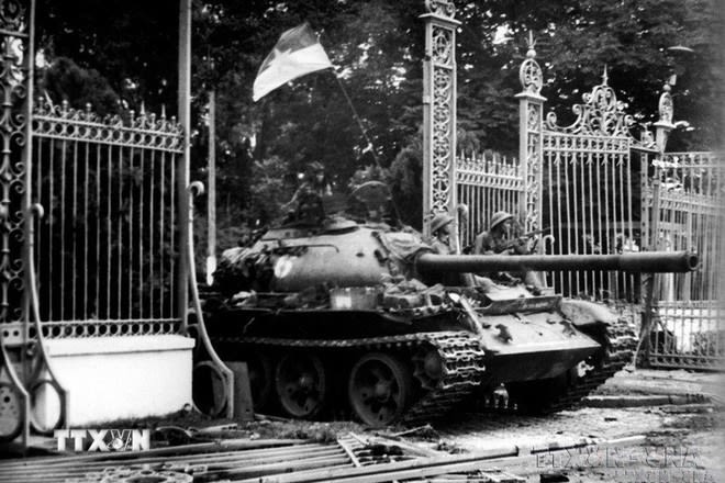 Los tanques del Ejército de Liberación toman control del Palacio de la Independencia al mediodía del 30 de abril de 1975, marcando el fin de la guerra de resistencia contra la invasión estadounidense, salvando al país, liberando completamente el Sur y reunificando el país. (Foto: Tran Mai Huong/VNA)