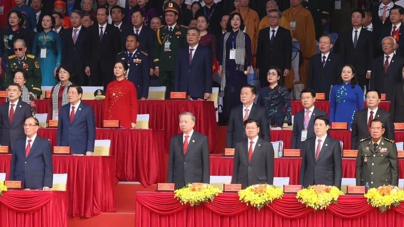 El secretario general del PCV, To Lam, junto a los delegados, observa el desfile desde la tribuna. (Foto: VNA)