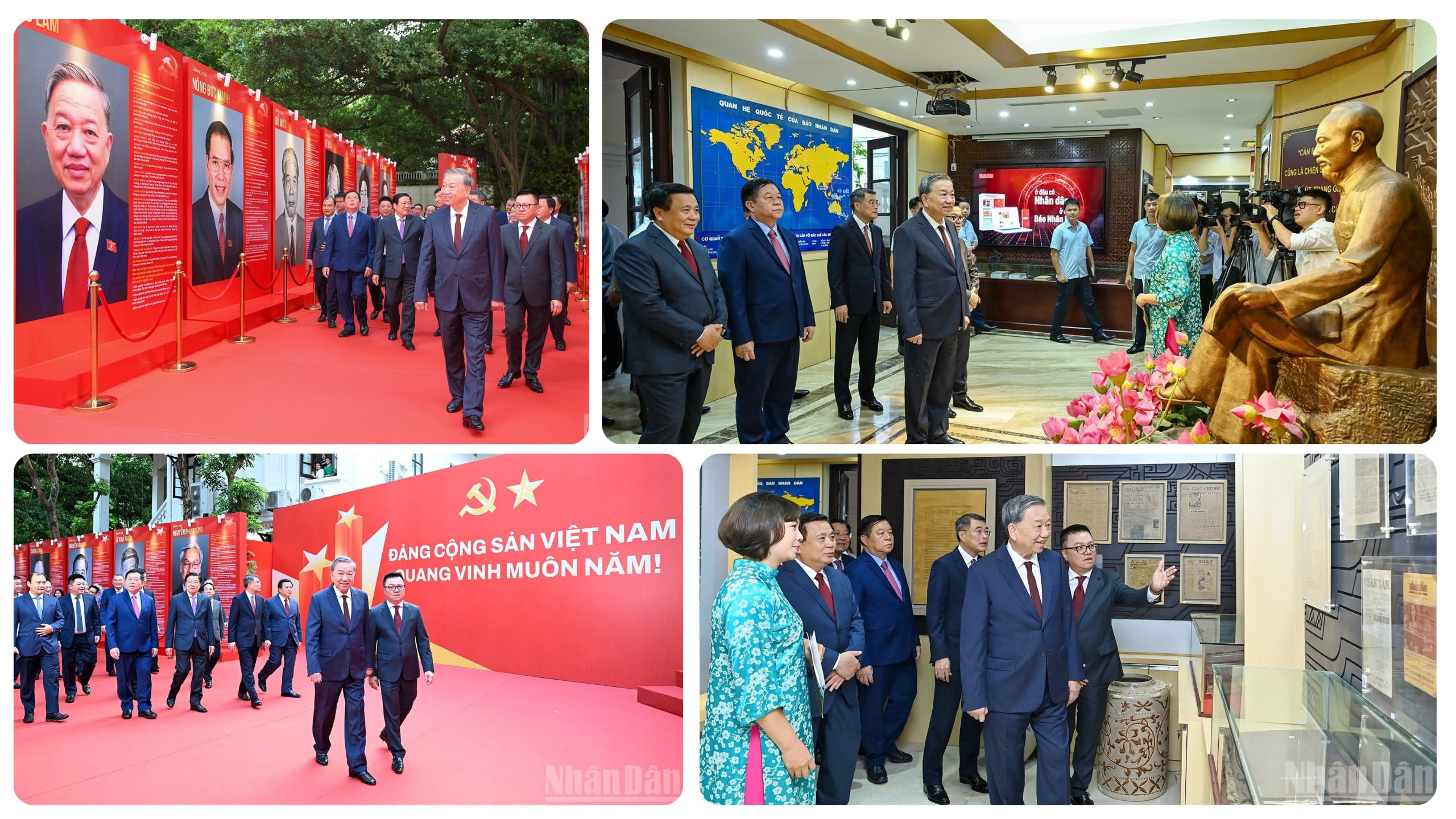 El secretario general del Partido Comunista de Vietnam, To Lam, y delegados recorren la sala memorial del periódico Nhan Dan y una exposición antes de la inauguración del portal.