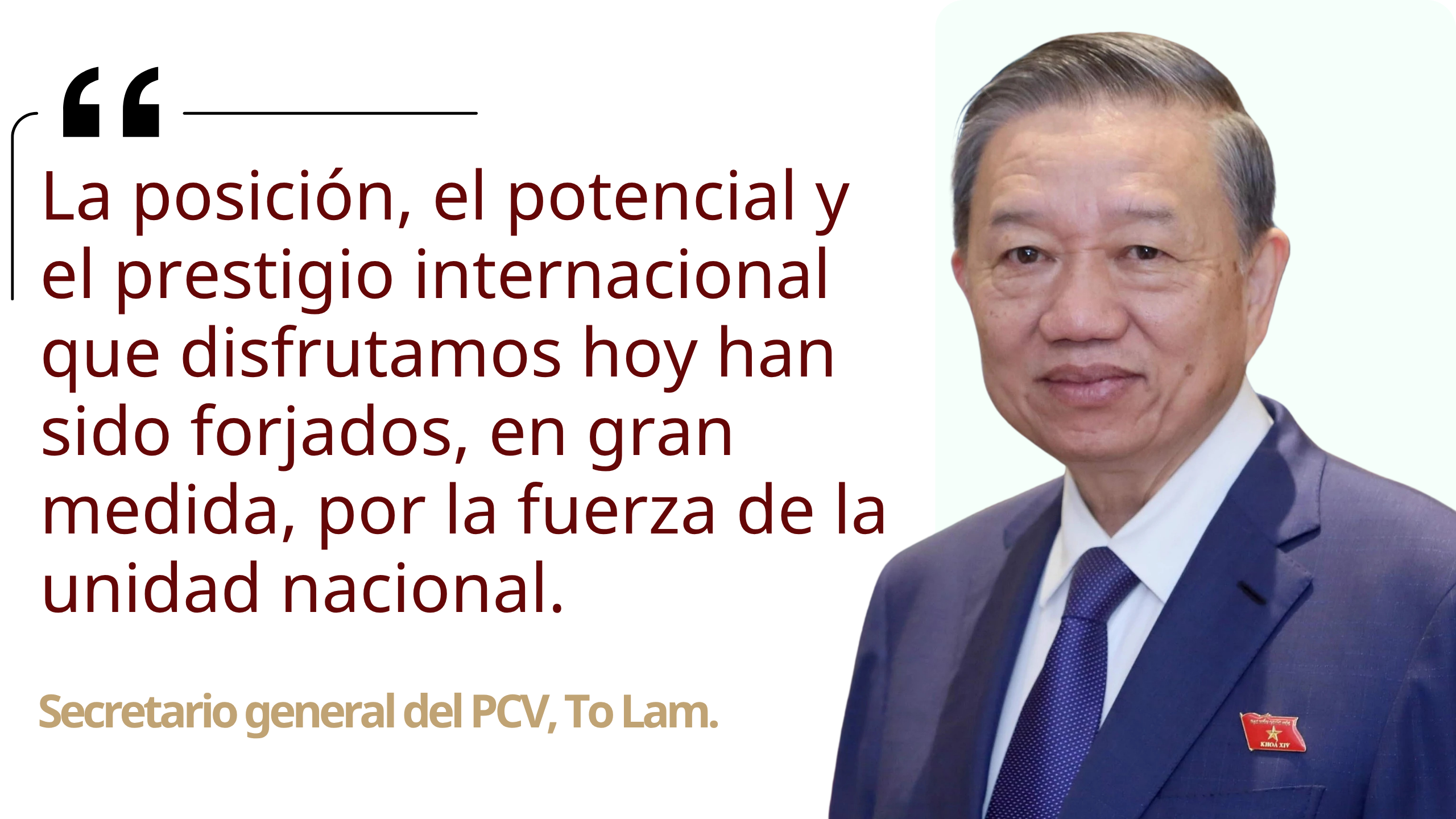 La historia de la revolución vietnamita ha demostrado esa enseñanza: cuando el pueblo está unido como uno solo, nuestro país goza de independencia y libertad; por el contrario, cuando hay desunión, sufrimos invasiones. Desde la Revolución de Agosto de 1945, la victoria de Dien Bien Phu en 1954, hasta la Gran Victoria de la Primavera de 1975 y hasta hoy, todos esos hitos gloriosos son la cristalización del poder de la gran unidad nacional – desde el profundo patriotismo hasta la voluntad de “es mejor sacrificarlo todo, pero definitivamente no perder el país, no volver a ser esclavos” . Fue precisamente la fuerza del pueblo, la cooperación solidaria de millones de vietnamitas patriotas, lo que permitió vencer a los imperios más poderosos del siglo XX. La posición, el potencial y el prestigio internacional que disfrutamos hoy han sido forjados, en gran medida, por la fuerza de la unidad nacional.