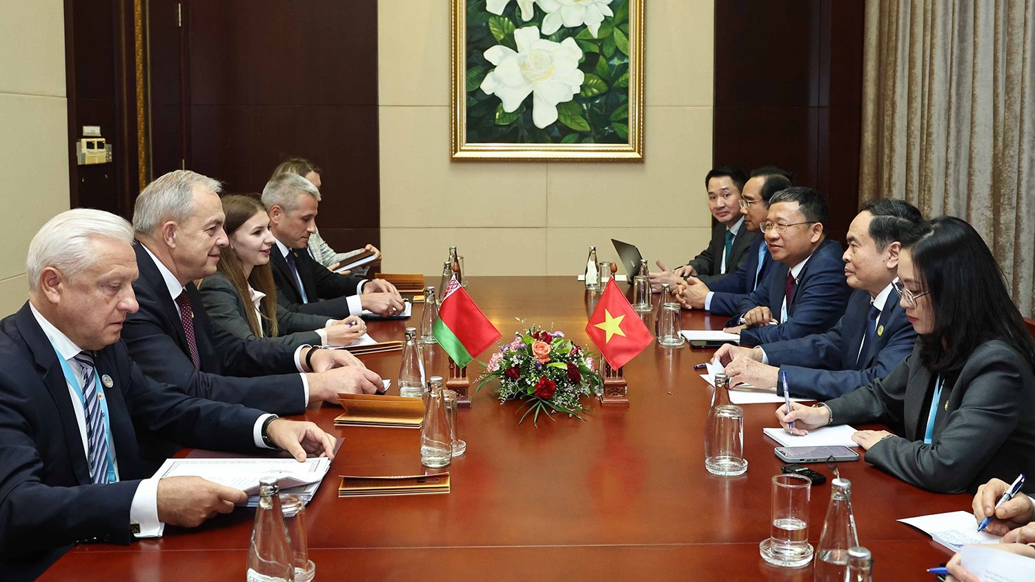 El presidente del Parlamento vietnamita, Tran Thanh Man, se reúne con el titular de la Cámara de Representantes de Belarús, Igor Sergeyenko. (Foto: VNA)