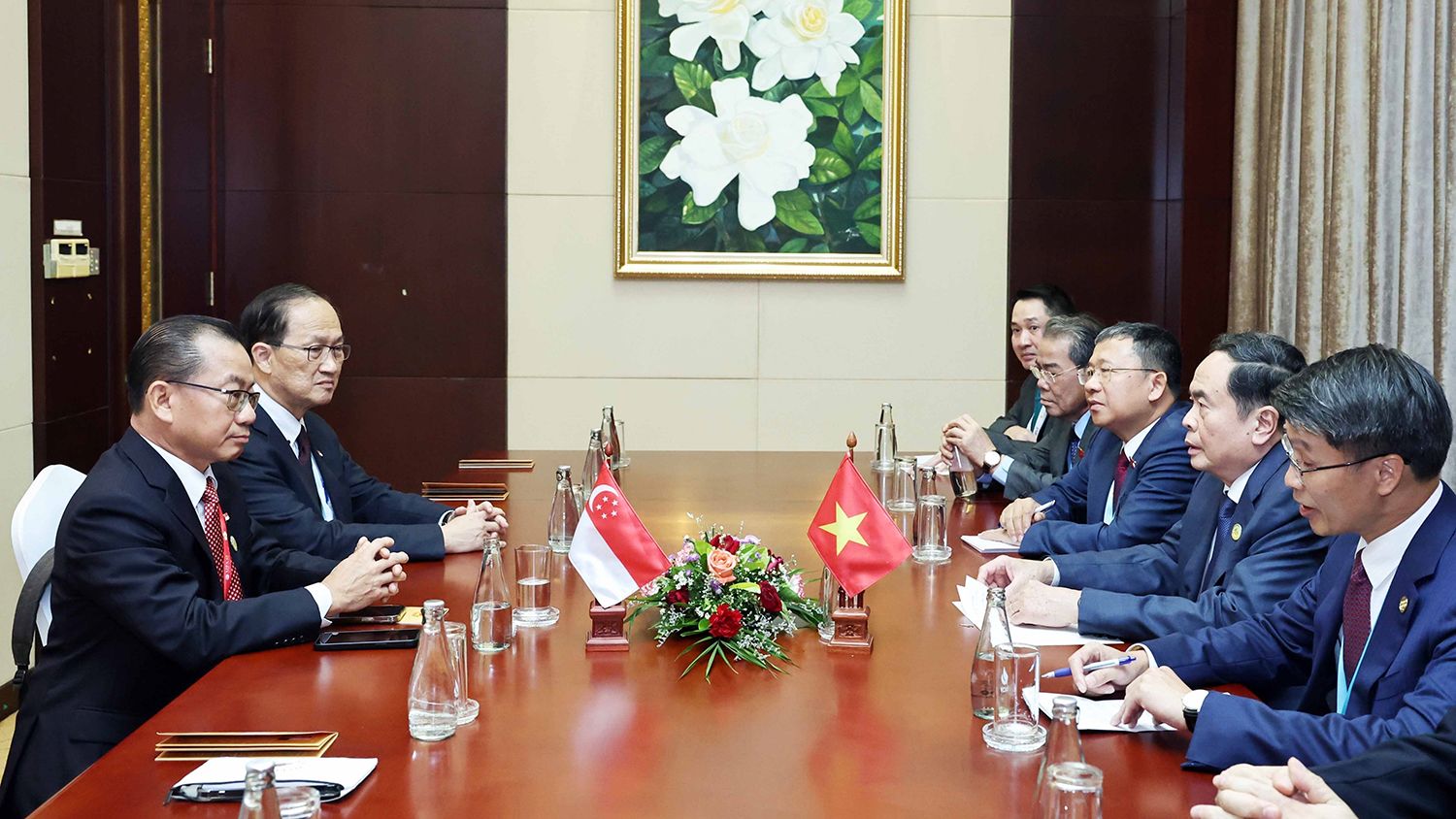 El presidente de la Asamblea Nacional vietnamita, Tran Thanh Man, se reúne con su homólogo de Singapur, Seah Kian Peng. (Foto: VNA)