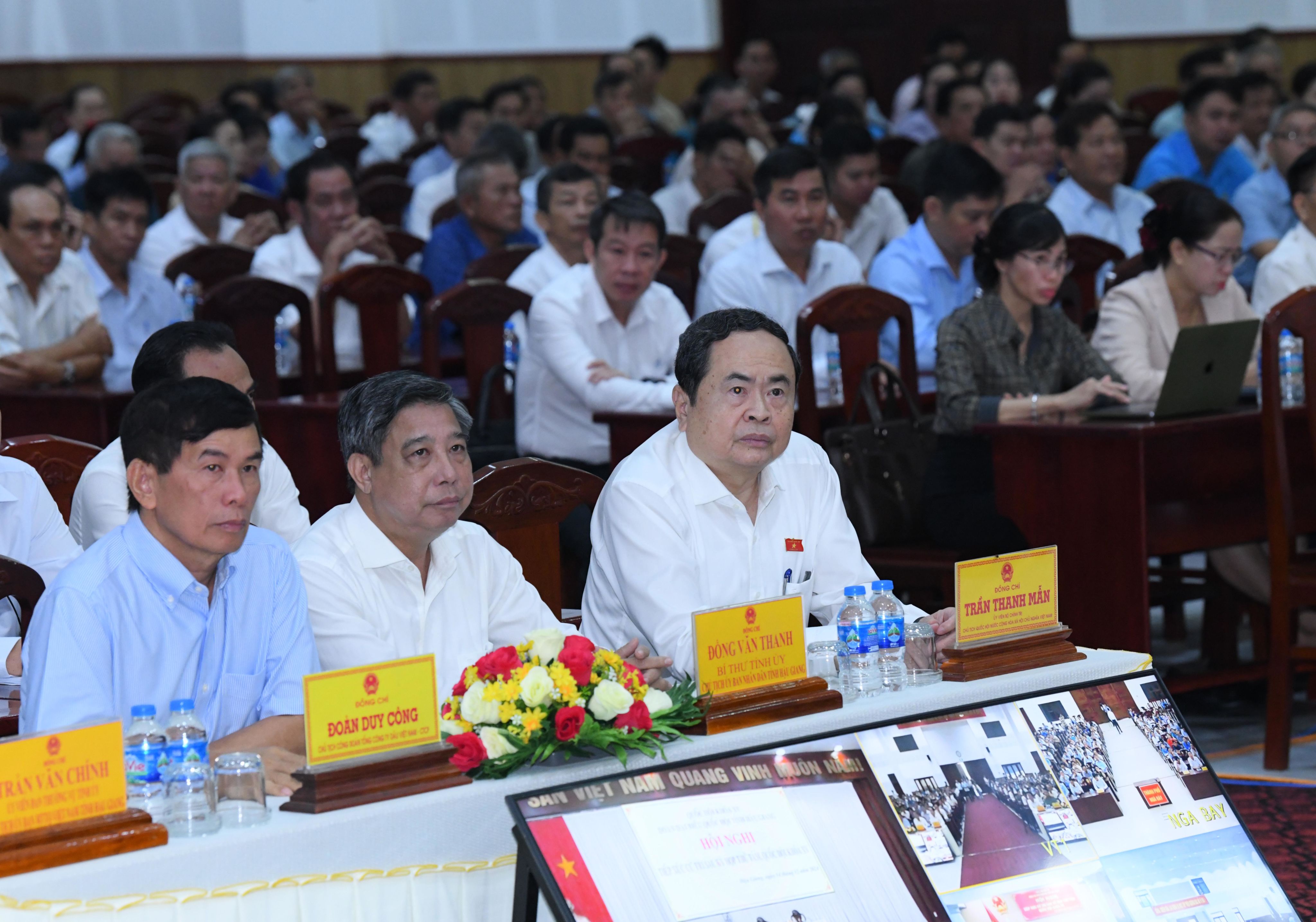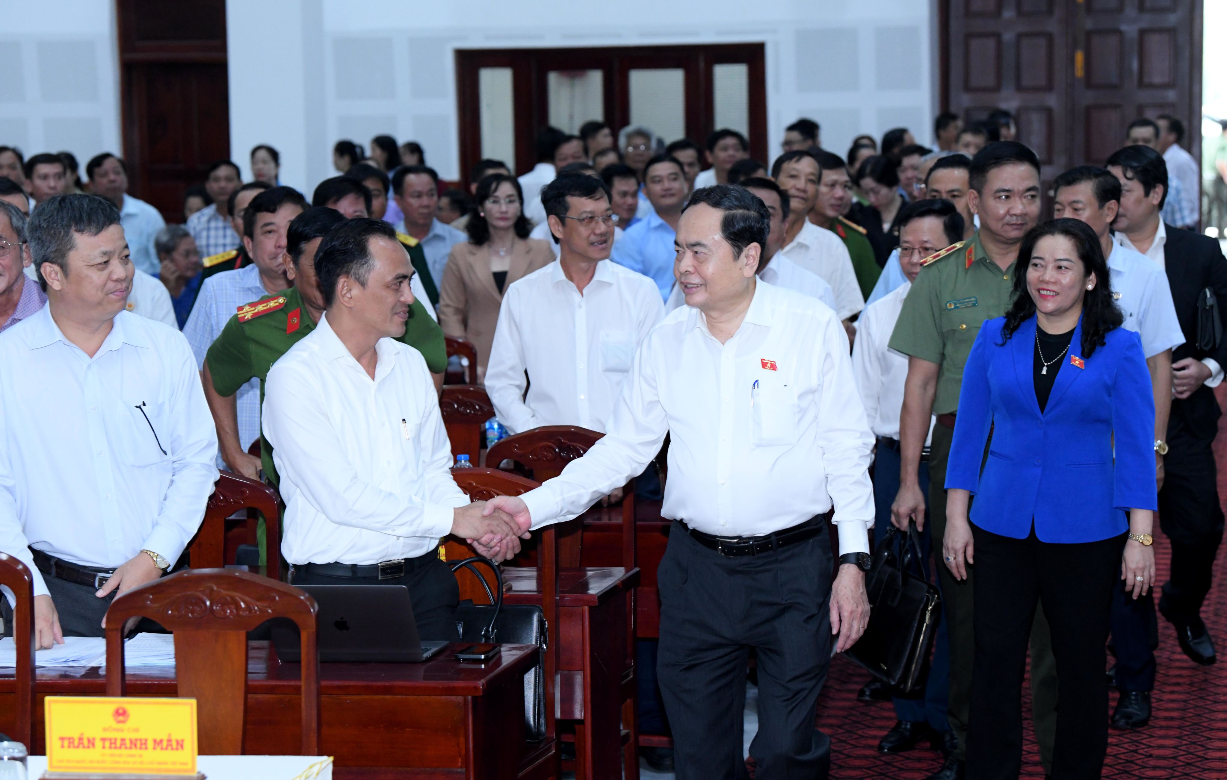 El presidente de la Asamblea Nacional de Vietnam, Tran Thanh Man, y otros diputados asisten a un encuentro con votantes en la provincia de Hau Giang tras el Octavo Período de Sesiones de la Asamblea Nacional de la XV Legislatura. (Foto: Lam Hien)
