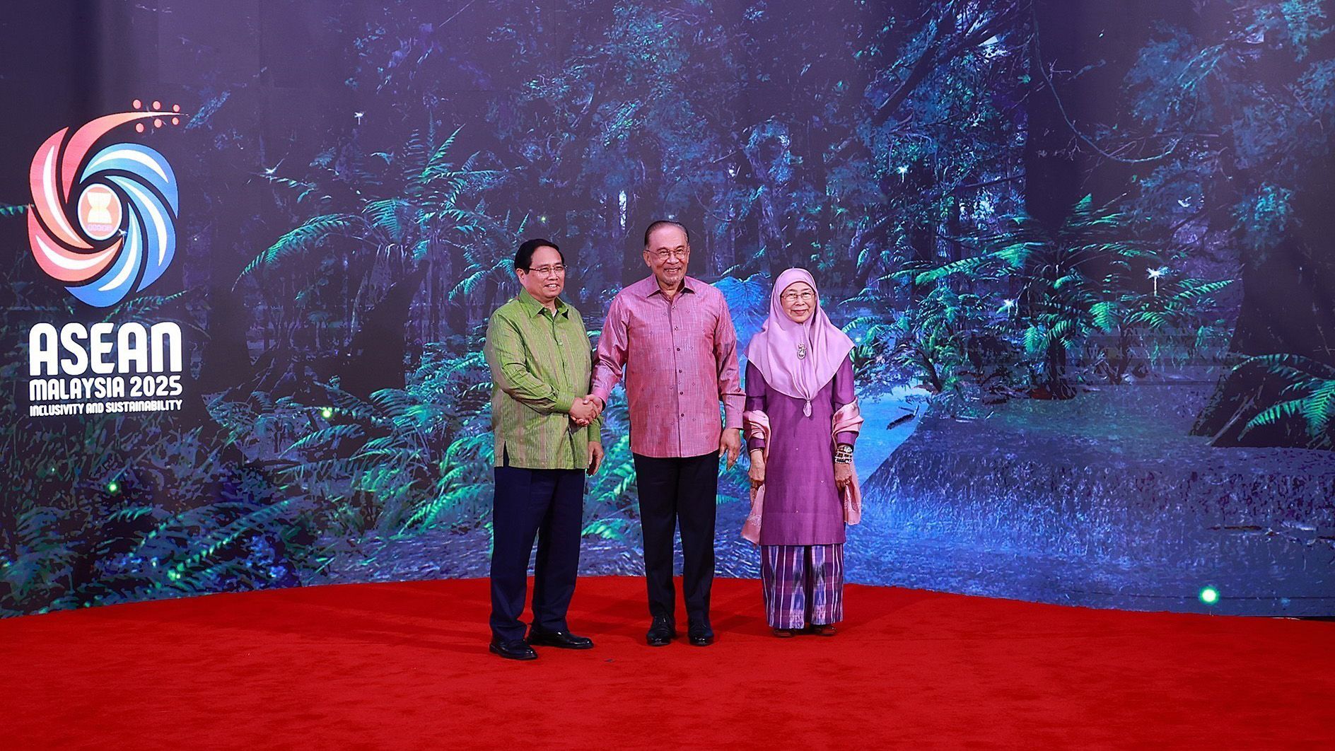 El primer ministro de Malasia, Anwar Ibrahim, presidente de la Asean 2025, y su esposa, reciben al premier vietnamita, Pham Minh Chinh. (Foto: VNA)