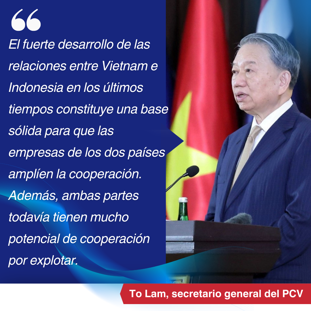 Basándose en los logros de la cooperación en 70 años de relaciones diplomáticas, el secretario general del PCV, To Lam, y el presidente indonesio, Prabowo Subianto, acordaron elevar los vínculos bilaterales al nivel de Asociación Estratégica Integral.