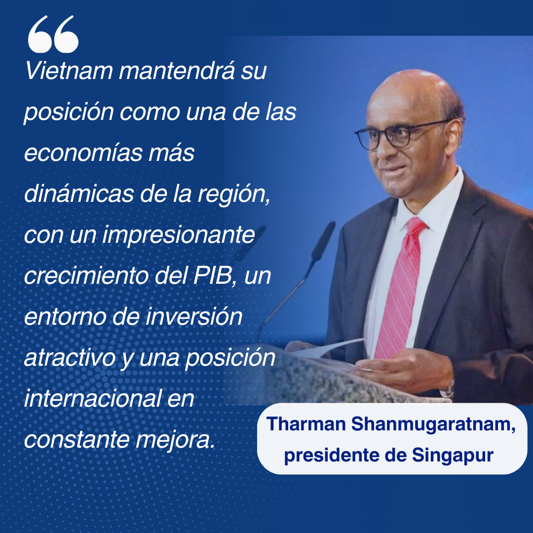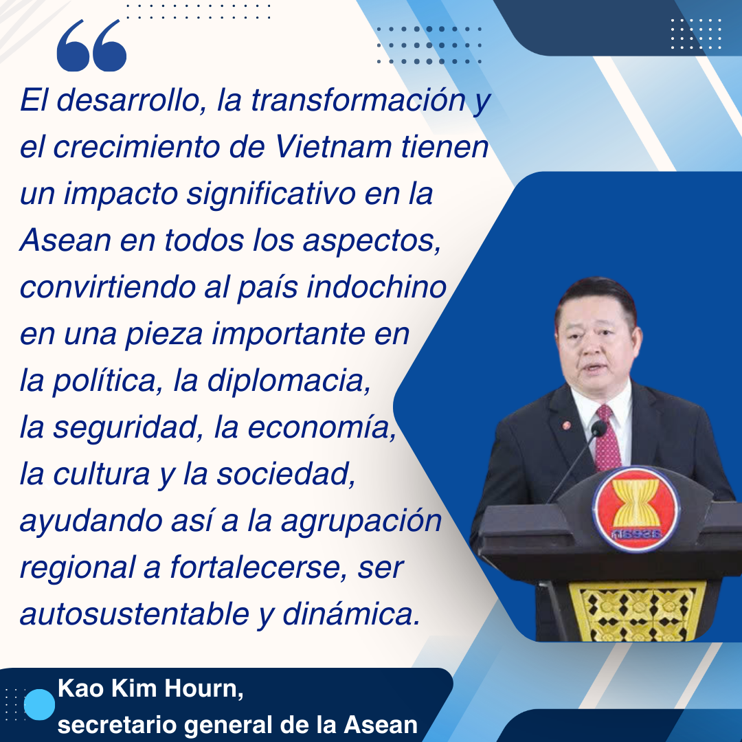 Según el dirigente, Vietnam siente un gran orgullo por el proceso de integración internacional que ha llevado en curso durante las últimas tres décadas. En ese camino, tiene a la Asean como punto de partida y premisa para su inserción cada vez mayor en la región y el mundo. Hasta el momento ha formalizado sus relaciones con 194 países, incluidos todos los integrantes y socios de importancia de la Asean. Además, ha establecido marcos de asociación integral, asociación estratégica o asociación estratégica integral con más de 30 países.