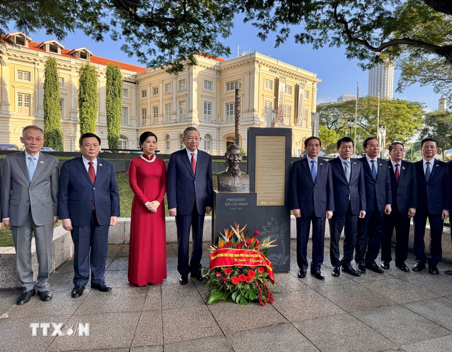 El secretario general To Lam y su esposa, y su comitiva rindieron homenaje al Presidente Ho Chi Minh con la ofrenda de flores en la estatua y estela conmemorativa dedicada al líder de la Revolución vietnamita en el Museo de Civilizaciones Asiáticas de Singapur.