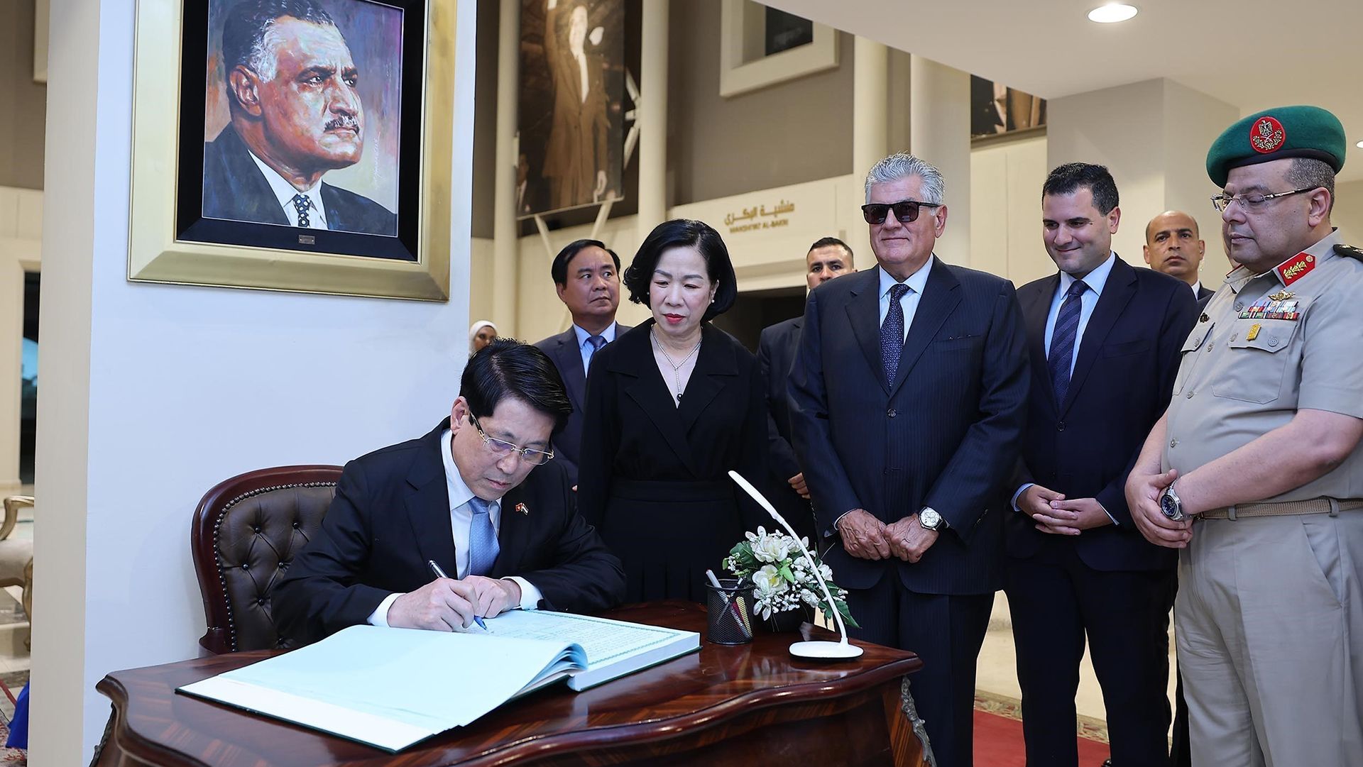 Al firmar el libro de visitas de la institución museística, Luong Cuong escribió: “Me conmovió profundamente contemplar el retrato del Presidente Ho Chi Minh, Héroe de la Liberación Nacional y Gran Hombre de Cultura, que él mismo firmó y obsequió al presidente Gamal Abdel Nasser. Es un profundo testimonio del afecto entre los dos líderes, así como de la solidaridad y la amistad entre los pueblos de Vietnam y Egipto. Estoy convencido de que los valores y el pensamiento del presidente Gamal Abdel Nasser seguirán siendo una antorcha que guiará a las generaciones de mañana, y fortalecerá la amistad y el entendimiento mutuo entre los países, incluido Vietnam”.
