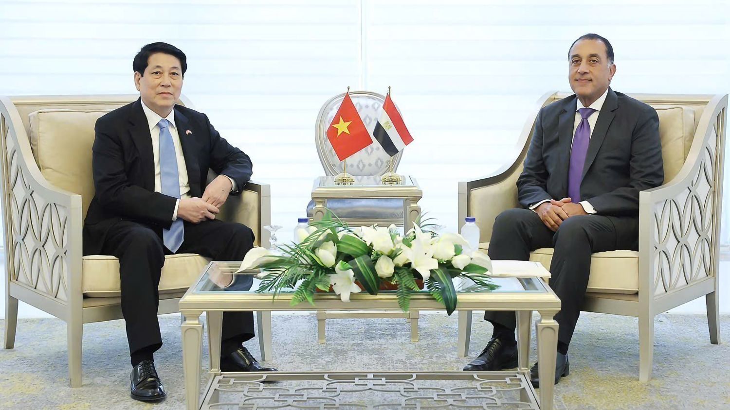 El presidente vietnamita, Luong Cuong, se reúne con el primer ministro egipcio, Mostafa Madbouly. (Foto: VNA)