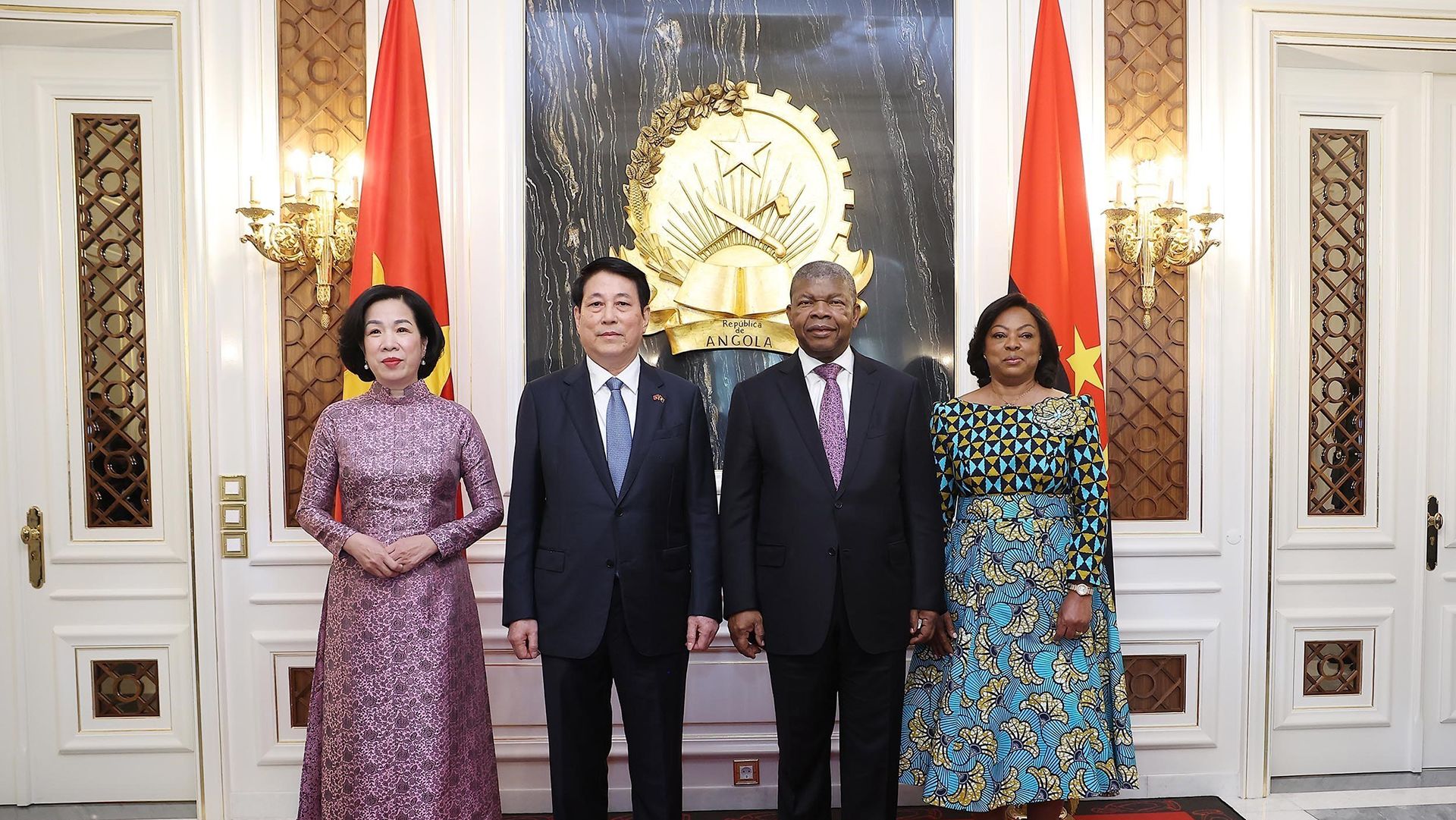 El presidente de Angola, João Manuel Gonçalves Lourenço, y su esposa dan la bienvenida al jefe de Estado vietnamita, Luong Cuong, y su esposa. (Foto: VNA)