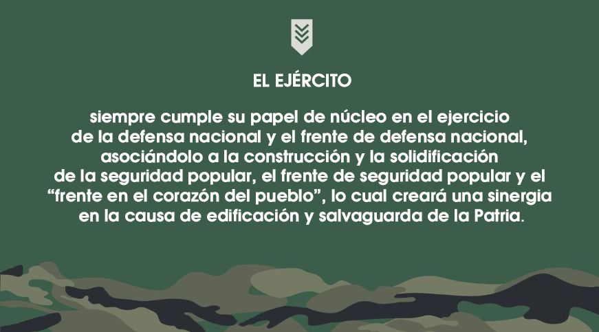 El Ejército siempre cumple su papel de núcleo en el ejercicio de la defensa nacional y el frente de defensa nacional, asociándolo a la construcción y la solidificación de la seguridad popular, el frente de seguridad popular y el “frente en el corazón del pueblo”, lo cual creará una sinergia en la causa de edificación y salvaguarda de la Patria.