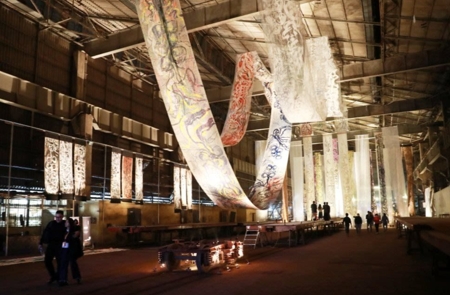 La exposición de la artista Tran Thi Thu, que presenta una instalación artística con pinturas sobre el tema "La llamada", "disipa" el ambiente sombrío del taller 3B1 (Fábrica de trenes de Gia Lam) en el Festival de Diseño Creativo de Hanói 2023. (Foto: Hanoimoi)
