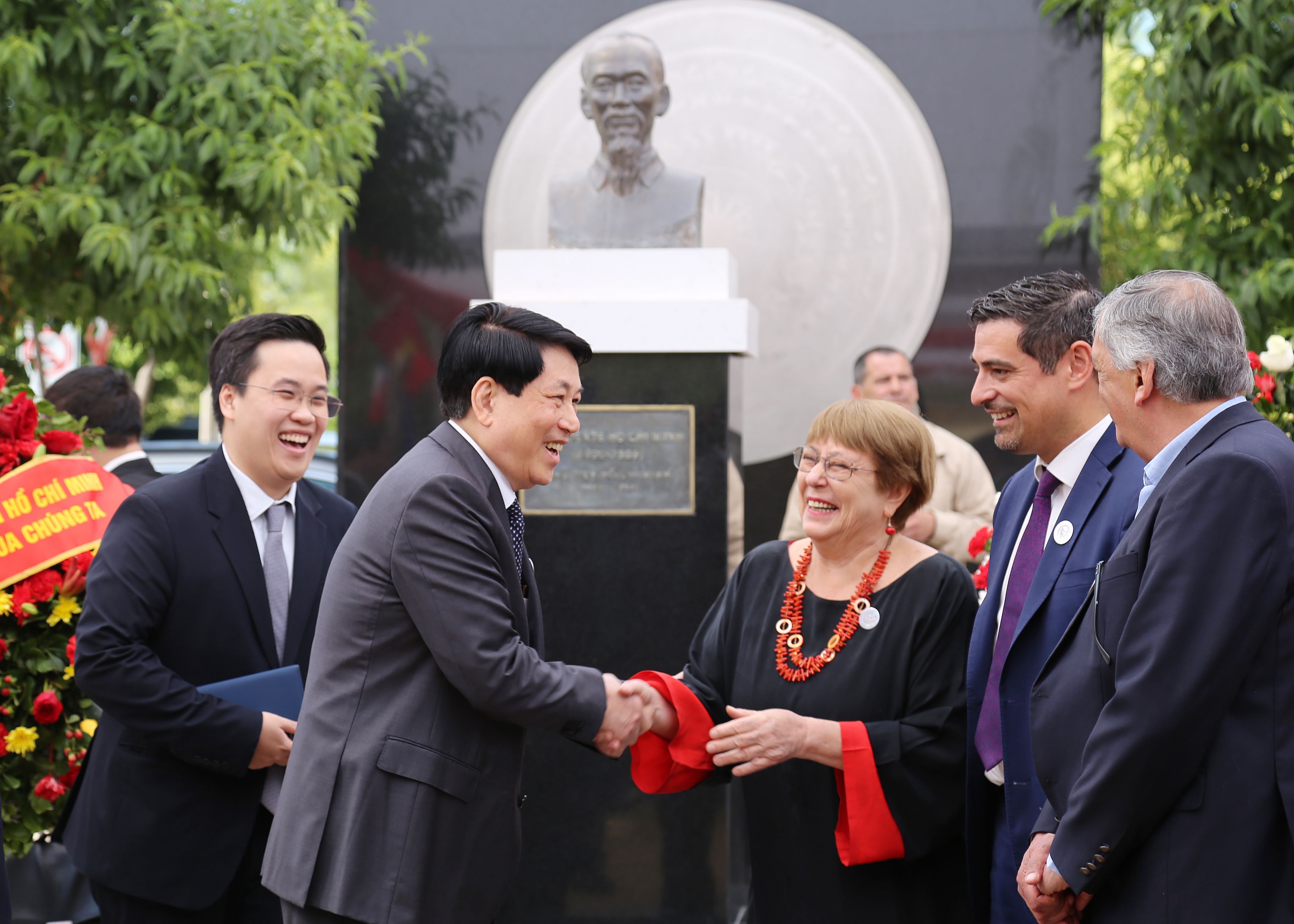 El presidente Luong Cuong y la ex presidenta chilena, Michelle Bachellet, en el acto de ofrenda de flores en el Monumento dedicado al Presidente Ho Chi Minh en Santiago, capital de Chile.