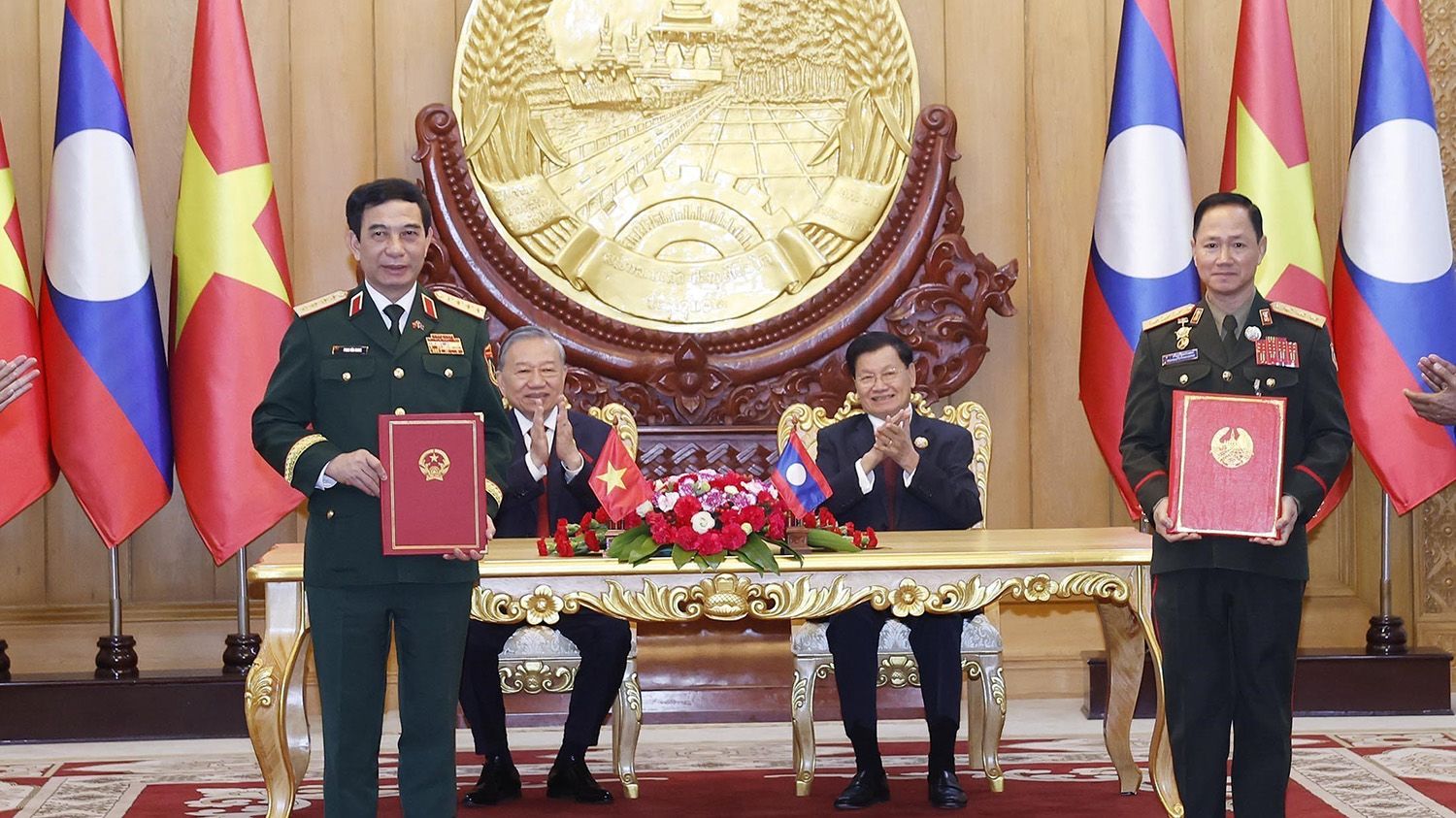 El secretario general del PCV, To Lam, y el secretario general del PPRL y presidente de Laos, Thongloun Sisoulith presencian la firma del Plan de Cooperación 2026 entre los Ministerios de Defensa de Vietnam y Laos. (Foto: VNA)