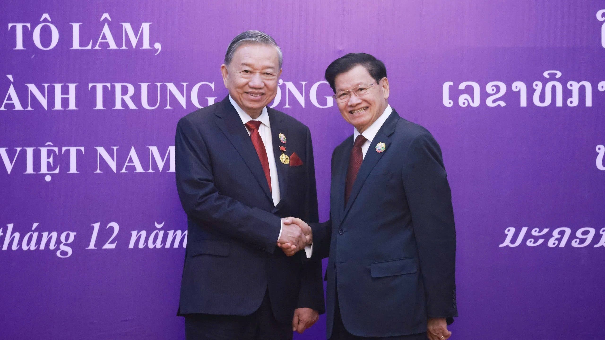 El secretario general del Partido Comunista de Vietnam, To Lam, y el secretario general del Partido Popular Revolucionario y presidente de Laos, Thongloun Sisoulith. (Foto: VNA)