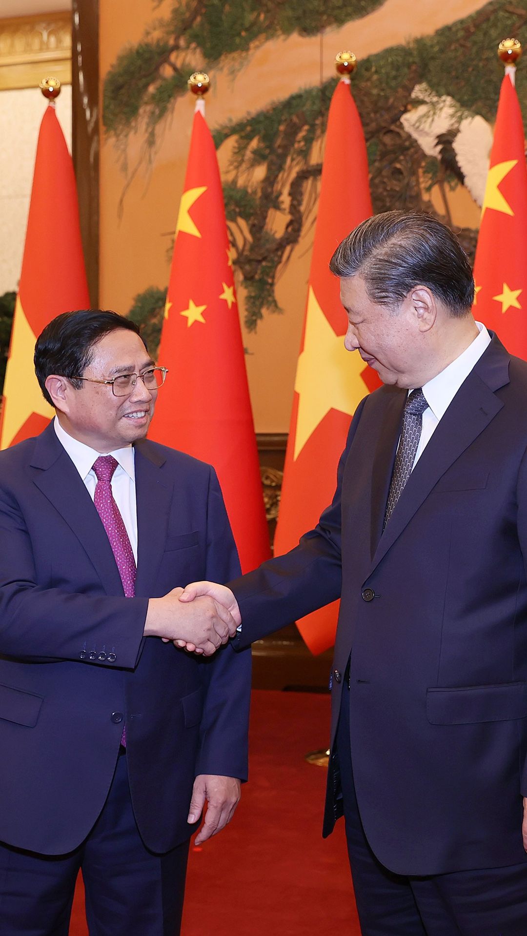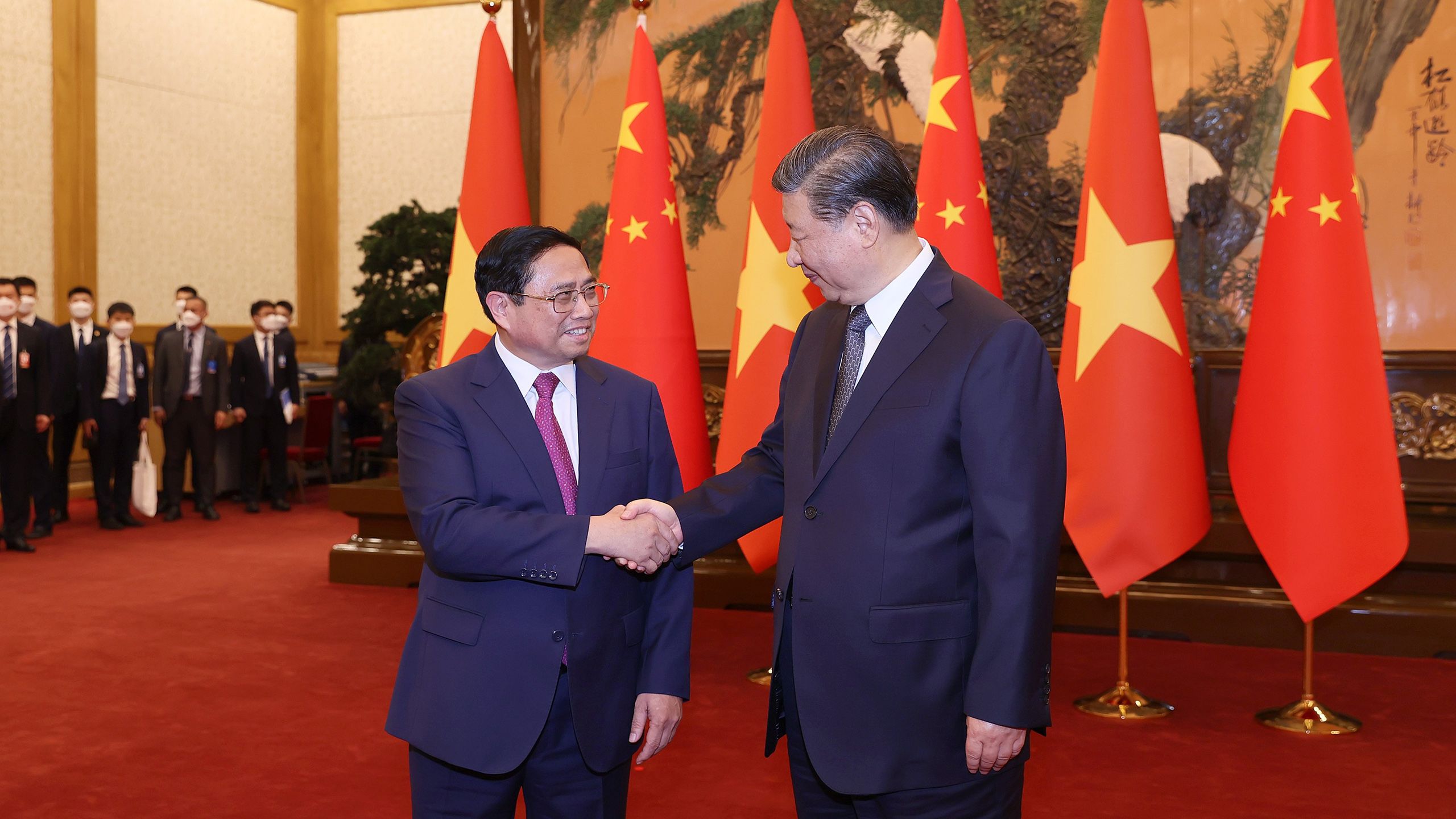 En el Gran Salón del Pueblo de Pekín se celebró una ceremonia oficial de bienvenida al primer ministro Pham Minh Chinh y la delegación vietnamita de alto nivel. En conversaciones con el secretario general del Partido Comunista y presidente de China, Xi Jinping, el jefe de Gobierno, Li Qiang, el presidente del Comité permanente de la Asamblea Popular Nacional, Zhao Leji, y el titular del Comité Nacional de la Conferencia Consultiva Política del Pueblo Chino, Wang Huning, el premier vietnamita reiteró que su país concede gran importancia a las buenas relaciones con el Partido, el Estado y el pueblo chinos.