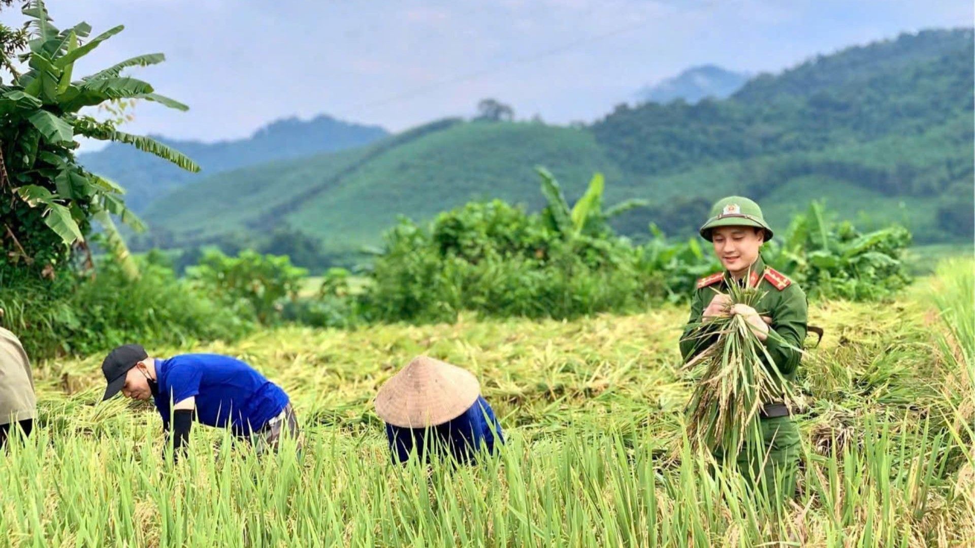 La fuerza policial ayuda a los agricultores a cosechar arroz.