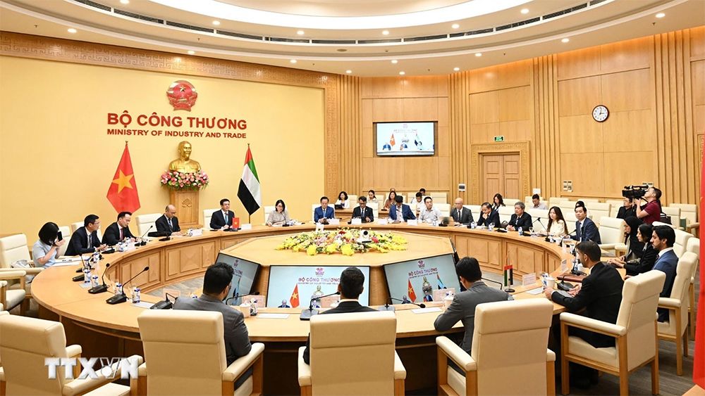 Escena de la reunión efectuada el 30 de julio de 2024 en Hanói entre el Ministerio de Industria y Comercio de Vietnam (MIC) y el de Economía de los EAU, presidida por el titular del MIC, Nguyen Hong Dien, y el ministro de Estado de Comercio Exterior emiratí, Thani bin Ahmed Al Zeyoudi. (Foto: VNA)
