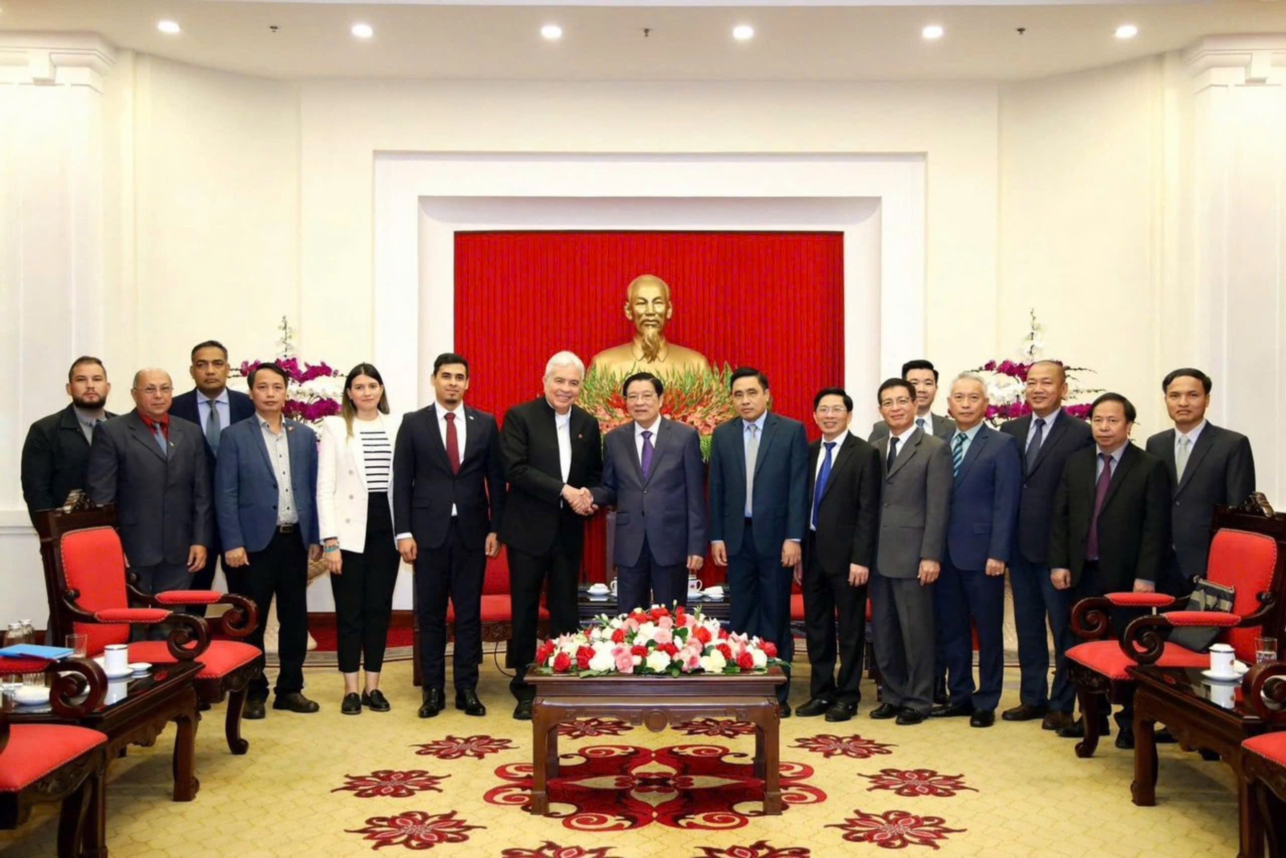 Phan Dinh Trac, miembro del Buró Político y del Secretariado del Comité Central del Partido Comunista de Vietnam y jefe de la Comisión de Asuntos Internos de ese comité, recibe a una delegación del Ministerio del Poder Popular para la Agricultura Productiva y Tierras de Venezuela encabezada por el titular de la cartera, Wilmar Castro Soteldo, en ocasión de su visita de trabajo a Vietnam y participación en el Festival Internacional del sector arroz de este país celebrado en la sureña provincia de Hau Giang en 2023. (Foto: Embajada de Venezuela en Vietnam)