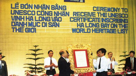 Ceremonia de entrega del certificado que designa a la bahía de Ha Long como Patrimonio Natural Mundial por primera vez.