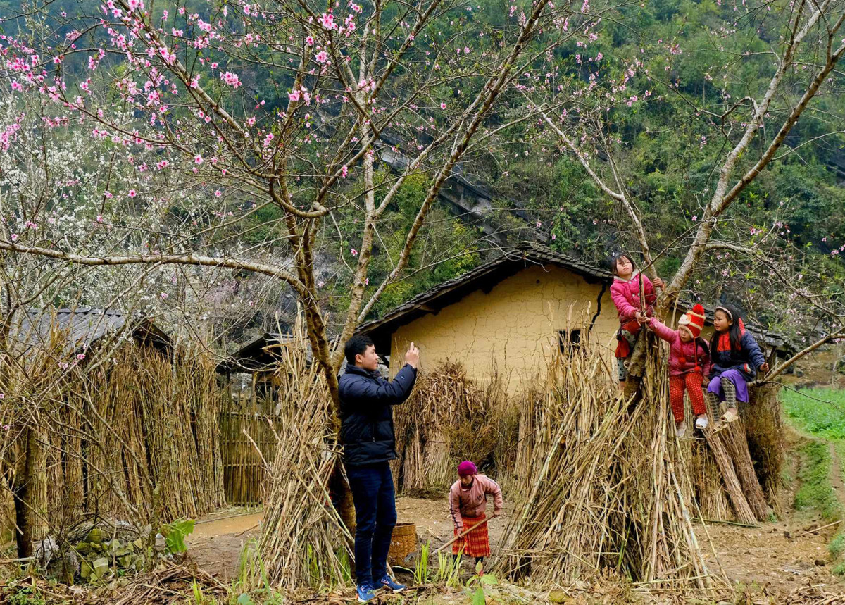 | En enero del calendario lunar, flores de ciruelo, albaricoque y algodonero brotan en todos los distritos de Ha Giang. En su momento más bello, la temporada atrae a una gran cantidad de turistas y fotógrafos. En la foto se ven ciruelos en flor bajo el mástil de la bandera de Lung Cu. |