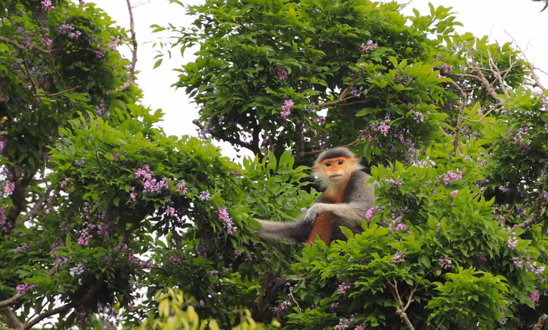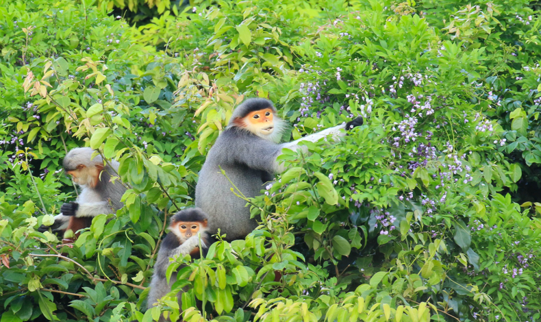 | A primera hora de la mañana o al atardecer, estos langures acuden en tropel a alimentarse en el árbol "than mat". |
