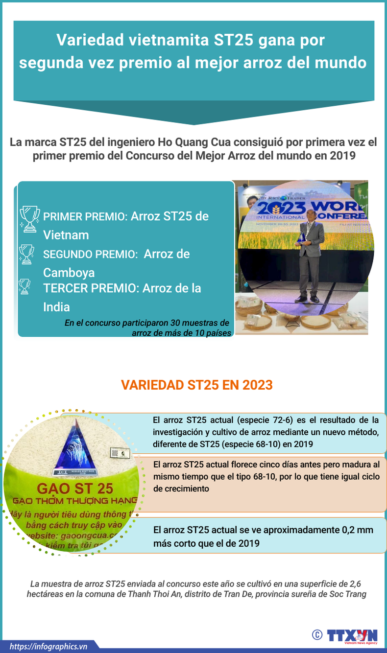 La variedad ST25 del ingeniero Ho Quang Cua superó a las de Camboya y la India para ganar el primer premio en el Concurso del Mejor Arroz del mundo en 2023. Se trata de la segunda vez que ST25 conquista ese honor.