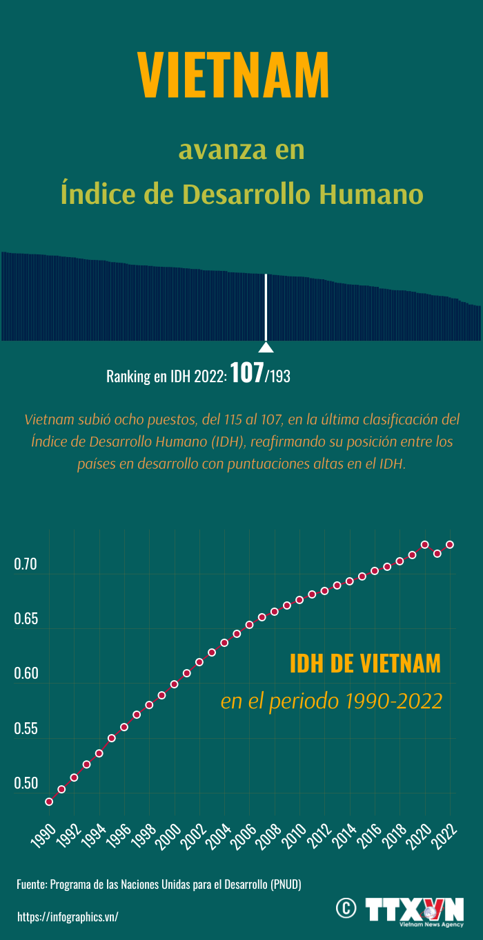 En la última clasificación del Índice de Desarrollo Humano, Vietnam ha subido ocho puestos, desde el puesto 115 al 107, y sigue figurando entre los países en desarrollo con un alto índice de desarrollo humano.