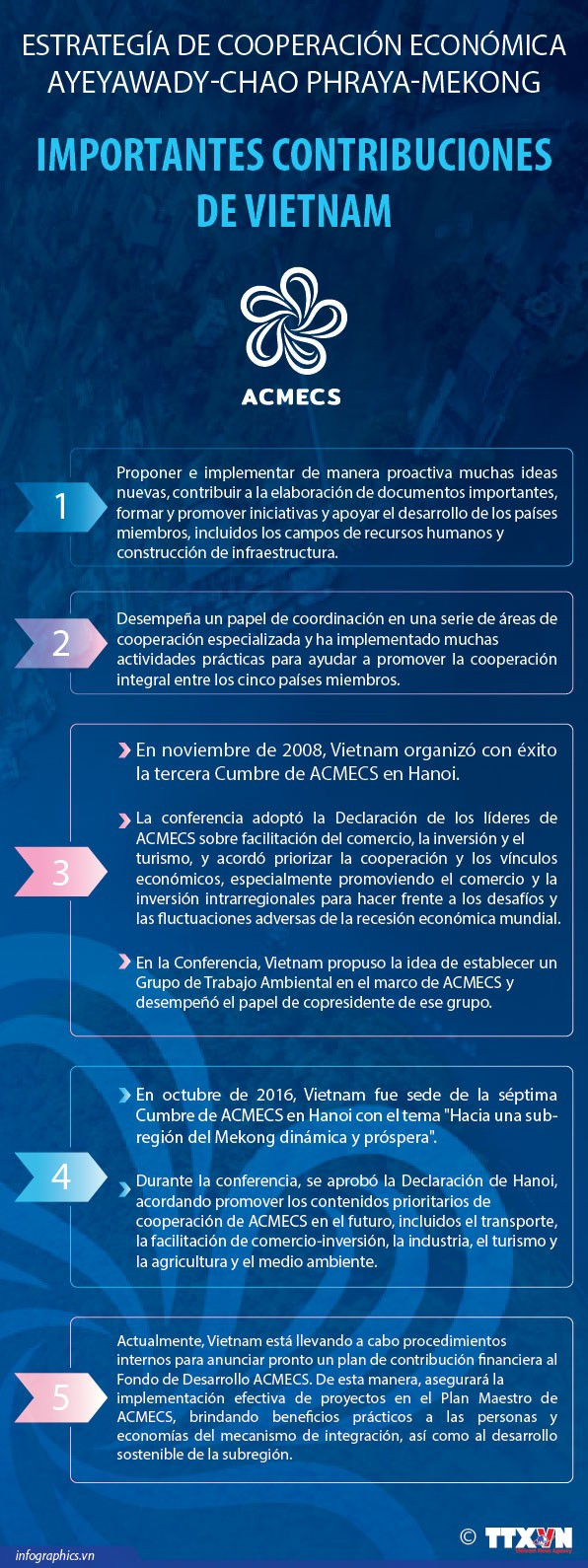 Vietnam se unió oficialmente a la Estrategia de Cooperación Económica Ayeyawady - Chao Phraya - Mekong (ACMECS) en la primera Conferencia Ministerial de la ACMECS, celebrada en Tailandia en noviembre de 2004. Como miembro activo y responsable, Vietnam ha realizado muchas contribuciones importantes a ACMECS.