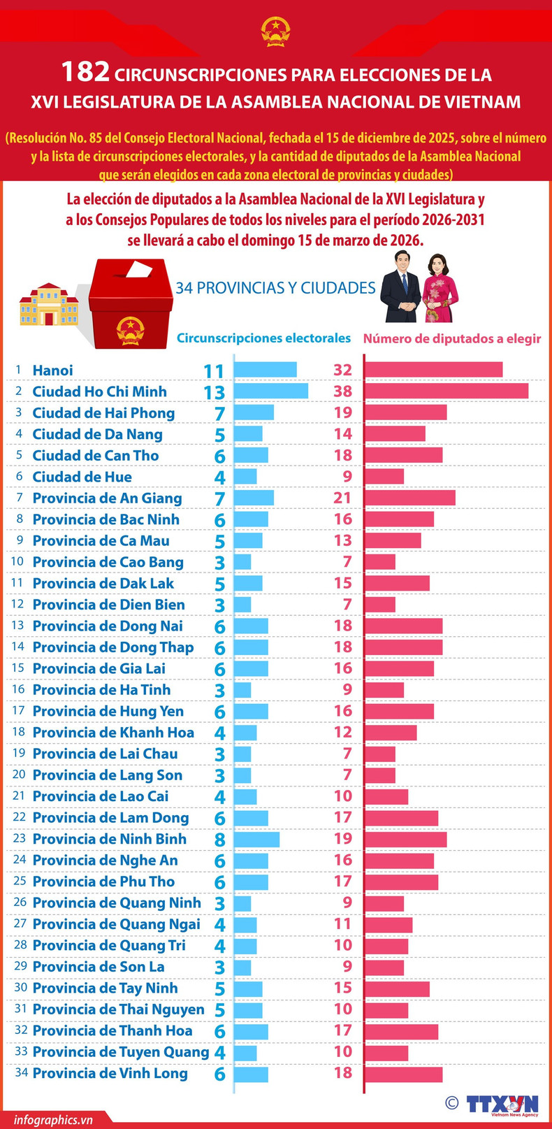 El presidente de la Asamblea Nacional, Tran Thanh Man, quien también preside el Consejo Electoral Nacional, firmó la Resolución No. 85/NQ-HDBCQG, que establece el número de unidades electorales, la lista correspondiente y la cantidad de diputados que se elegirán en cada circunscripción de las provincias y ciudades del país.
