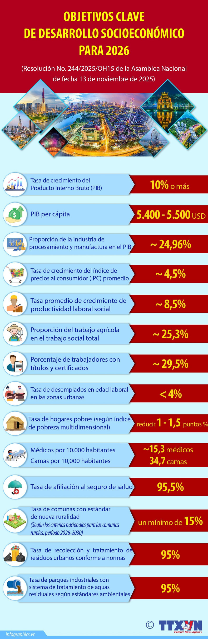 En el décimo período de sesiones de la Asamblea Nacional de la XV Legislatura, celebrada el 13 de noviembre de 2025, se aprobó la Resolución No. 244/2025/QH15, que establece ambiciosos objetivos para el desarrollo económico y social de Vietnam en 2026. Entre las metas más destacadas, el país se propone alcanzar un crecimiento del Producto Interno Bruto (PIB) de al menos el diez por ciento y un PIB per cápita de entre cinco mil 400 y cinco 500 dólares.