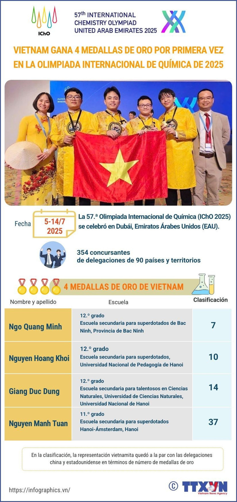El equipo vietnamita ha ganado cuatro medallas de oro en la Olimpiada Internacional de Química (OIC) de 2025. Esta es también la primera vez en la historia que Vietnam alcanzó este resultado.