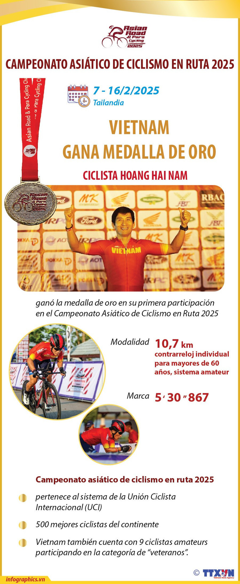 El veterano ciclista vietnamita Hoang Hai Nam ganó una medalla de oro en la prueba de contrarreloj individual de 10,7 km en el Campeonato Asiático de Ciclismo en Ruta de 2025. Es la primera vez que el ciclismo amateur vietnamita participa en el circuito continental y este logro marca un hito memorable para los deportes del país. El torneo lleva a cabo en Tailandia del 7 al 16 de febrero de 2025.