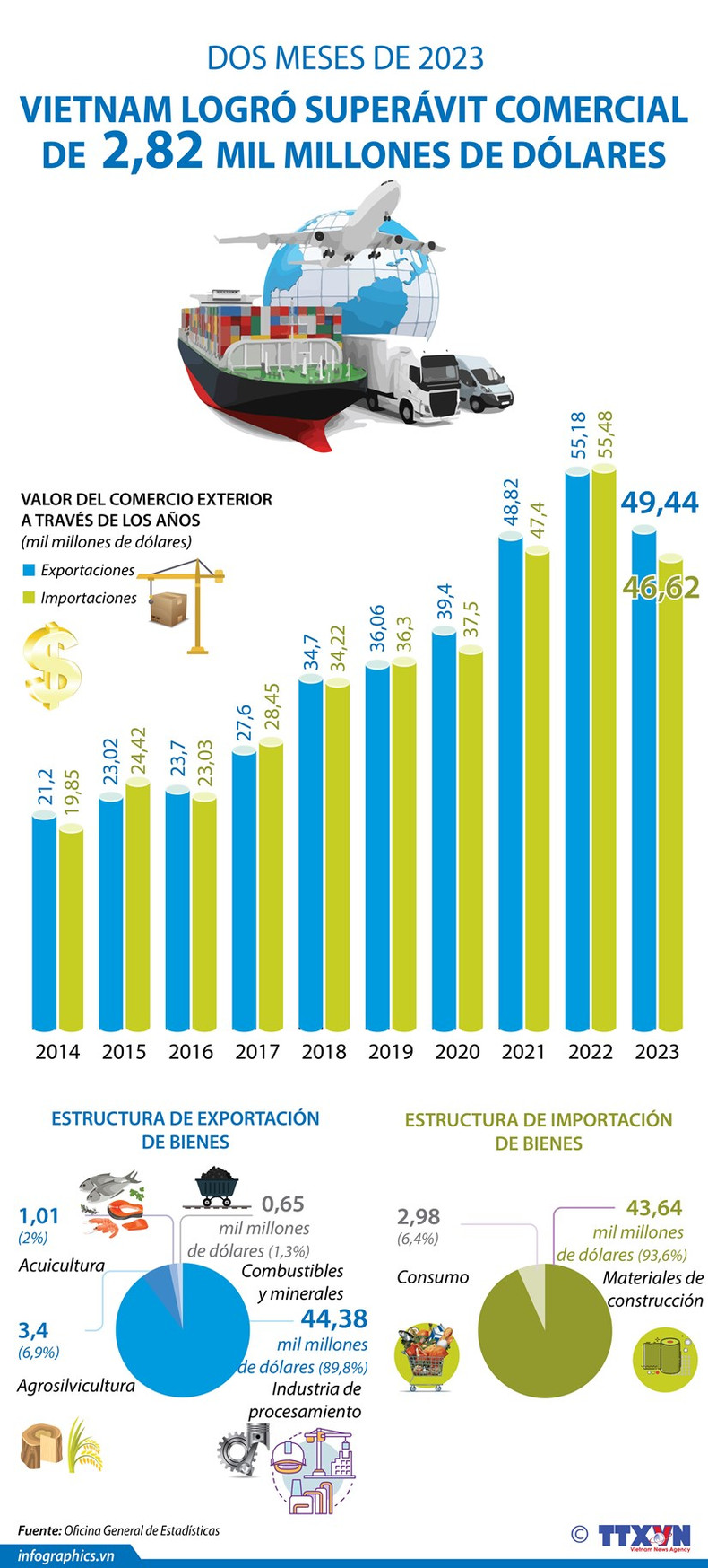 Vietnam reportó un superávit comercial de 2,82 mil millones de dólares en los dos primeros meses del presente año, informó la Oficina General de Estadísticas.