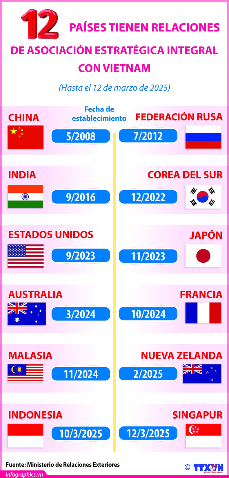 En el marco de la visita oficial a la República de Singapur del 11 al 13 de marzo de 2025 del secretario general del Partido Comunista de Vietnam, To Lam, los dos países elevaron sus relaciones a una Asociación Estratégica Integral. A partir del 12 de marzo de 2025, el país indochino mantiene asociaciones estratégicas integrales con 12 países de diiferentes continentes.