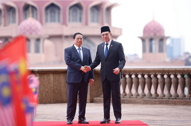 El primer ministro de Malasia, Anwar Ibrahim, recibe al primer ministro de Vietnam, Pham Minh Chinh, durante la visita oficial del último a Malasia. (Fuente: VNA)