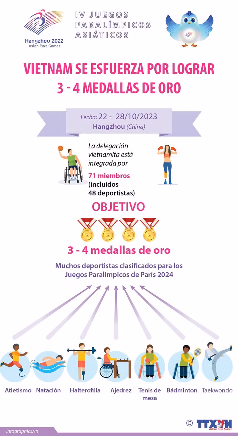 Vietnam se esfuerza por lograr de tres a cuatro medallas de oro en los Juegos Paralímpicos Asiáticos, que tienen lugar del 22 al 28 del presentes mes en Hangzhou, China.
