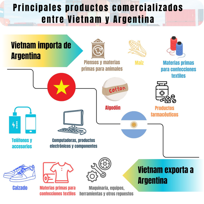 Por su parte, Argentina compró productos vietnamitas como teléfonos y accesorios, ordenadores, productos y componentes electrónicos, calzado, materias primas textiles, maquinaria, equipos, herramientas y otras piezas de repuesto.
