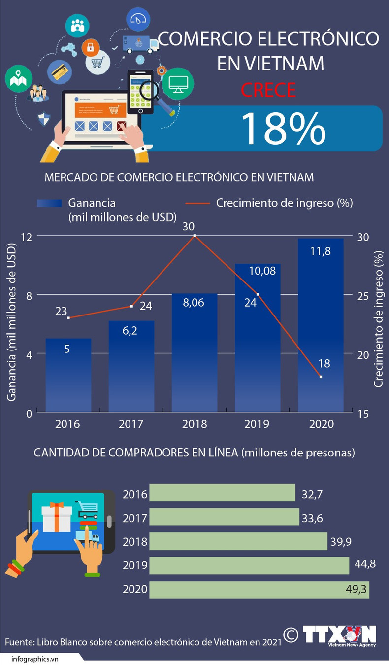 Según el informe sobre el comercio electrónico del Sudeste Asiático publicado por la plataforma OpenGov Asia, el mercado de comercio electrónico de Vietnam logró una tasa de crecimiento anual promedio de 16-30 por ciento en los últimos cuatro años, la más alta del mundo.
