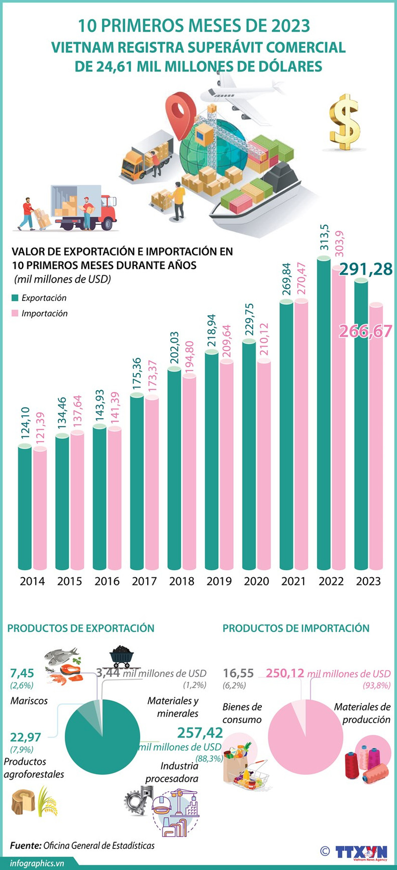 Durante los 10 primeros meses del año, el valor de exportaciones e importaciones de Vietnam alcanzó 557,95 mil millones de dólares y el país registró un superávit comercial de 24,61 mil millones de dólares.