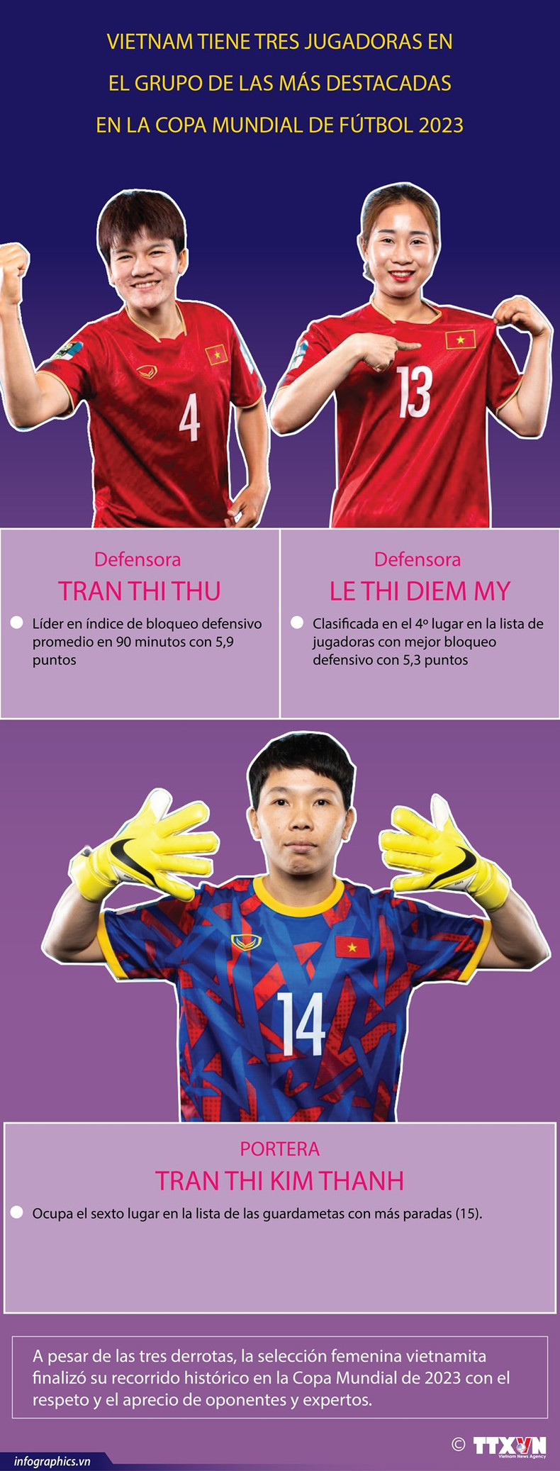 Vietnam tiene tres clasificadas: Tran Thi Kim Thanh, Tran Thi Thu y Le Thi Diem My, en la lista de mejores jugadoras por cada posición en la plantilla de las selecciones participantes en la Copa Mundial 2023, según la clasificación de FIFA.