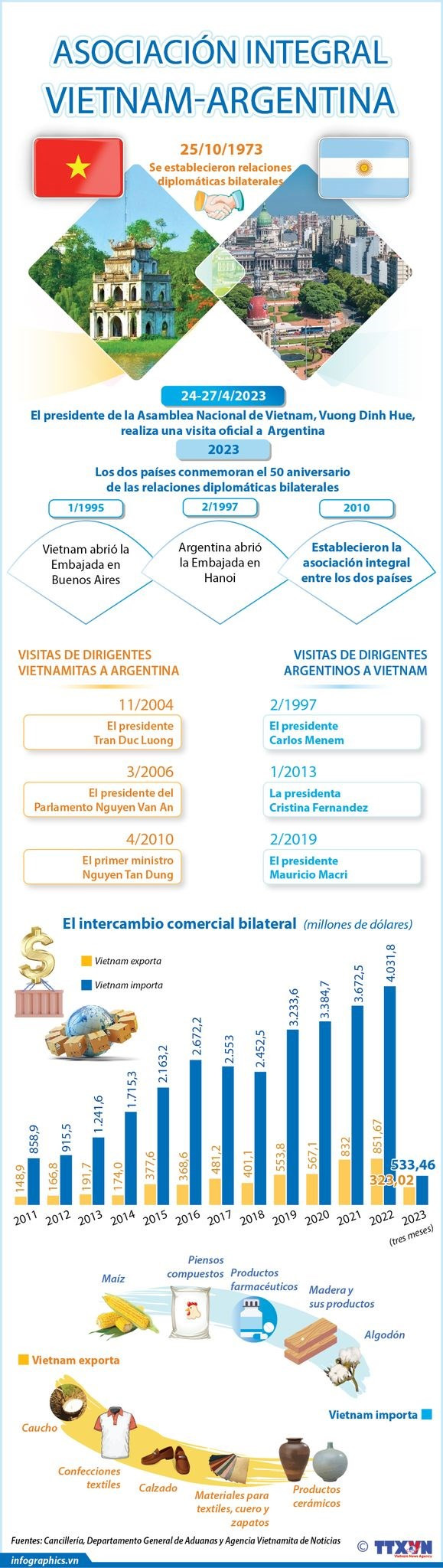 El 25 de octubre de 1973, Argentina se convirtió en uno de los tres países latinoamericanos (después de Cuba y Chile) que establecieron relaciones diplomáticas con Vietnam. Durante los últimos 50 años, la amistad y la cooperación entre ambas naciones se han consolidado y desarrollado sin cesar.