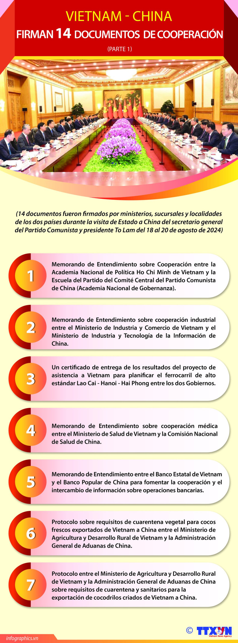 El secretario general del Partido Comunista de Vietnam y presidente del país, To Lam, y su homólogo chino, Xi Jinping, presenciaron la firma de 14 documentos de cooperación entre ministerios, agencias y localidades de los dos países el 19 de agosto como parte de la visita de Estado del máximo dirigente vietnamita a China.