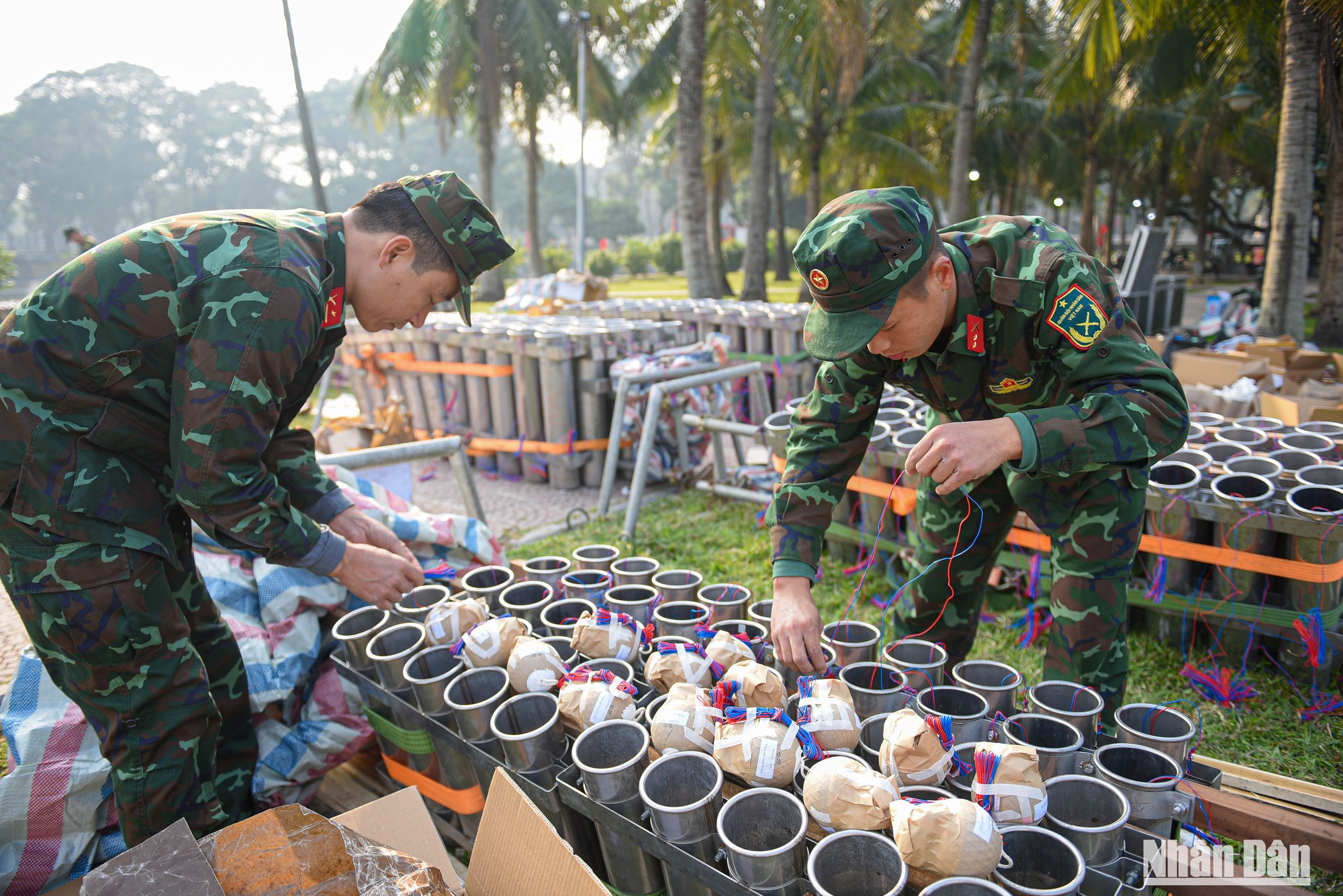 |   De acuerdo con el coronel Pham Hong Chung, jefe del Mando Militar distrital, la instalación de 60 cohetes de fuegos artificiales aéreos y 90 barriles de fuegos artificiales terrestres se lleva a cabo con presteza, pero en absoluto cumplimiento del protocolo de seguridad. También se ha programado un horario específico para cada espectáculo.  |