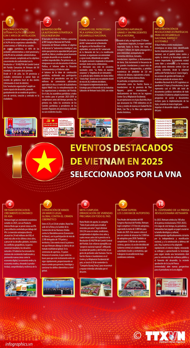 sábado, diciembre 27, 2025 10:33 VNA selecciona los 10 eventos más destacados de Vietnam en 2025 La Agencia Vietnamita de Noticias (VNA) les presenta los 10 eventos más destacados del país en 2025.