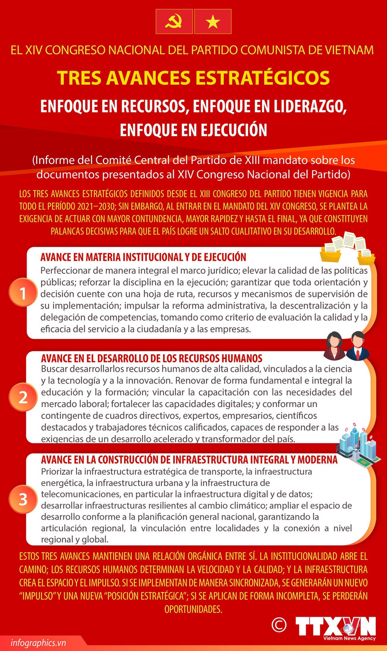 Los avances estratégicos definidos desde el XIII Congreso del Partido tienen vigencia para todo el período 2021–2030; sin embargo, al entrar en el mandato del XIV Congreso, se plantea la exigencia de actuar con mayor contundencia, mayor rapidez y hasta el final, ya que constituyen palancas decisivas para que el país impulse decididamente su desarrollo.